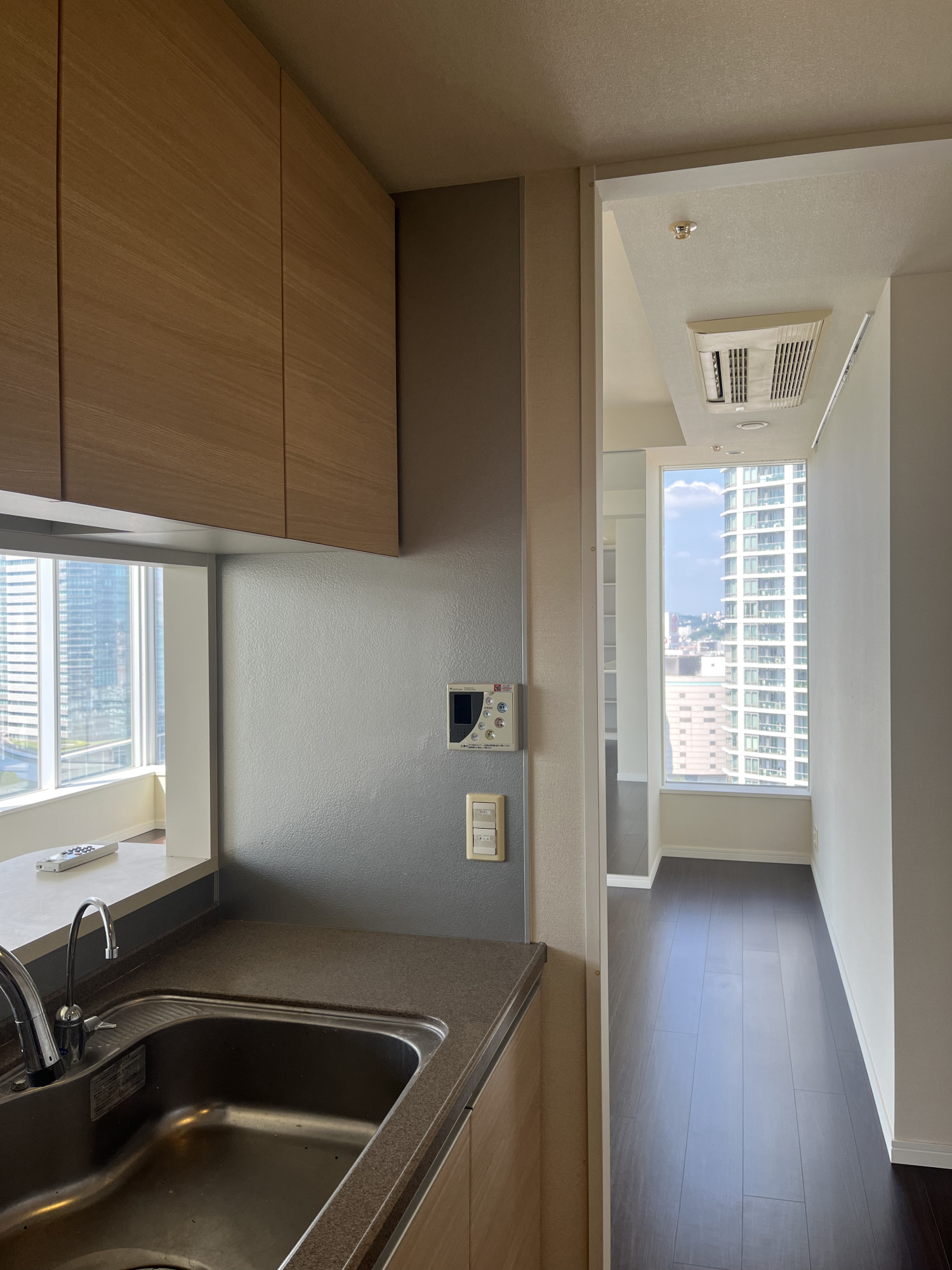 ■after■リビングとの壁を無くして対面式キッチンに変更。キッチン側からベランダへ出れる間取りになっているので、洗濯機スペースをキッチン内に設置しました。洗濯を干す動線が楽になります。明かりはダウンライトに交換、天井もスッキリと高く感じます。 before ■after■