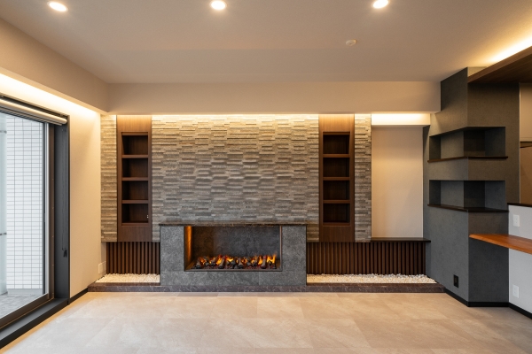 今回メインになるインテリア暖炉 本物の炎のような揺らめきと薪のはぜる疑似音は癒し効果があります。暖炉横はルーバをつけて玉石を敷き、ホテルラウンジのような雰囲気に「和」の要素も取り入れました。