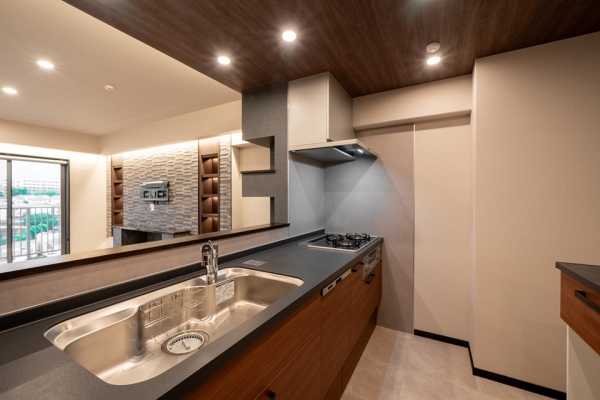 キッチンはPanasonicS-CLASS 吊戸棚をなくしてオープンキッチンに、照明もダウンライトのみでフラットにする事で視覚的に空間が広く感じます。